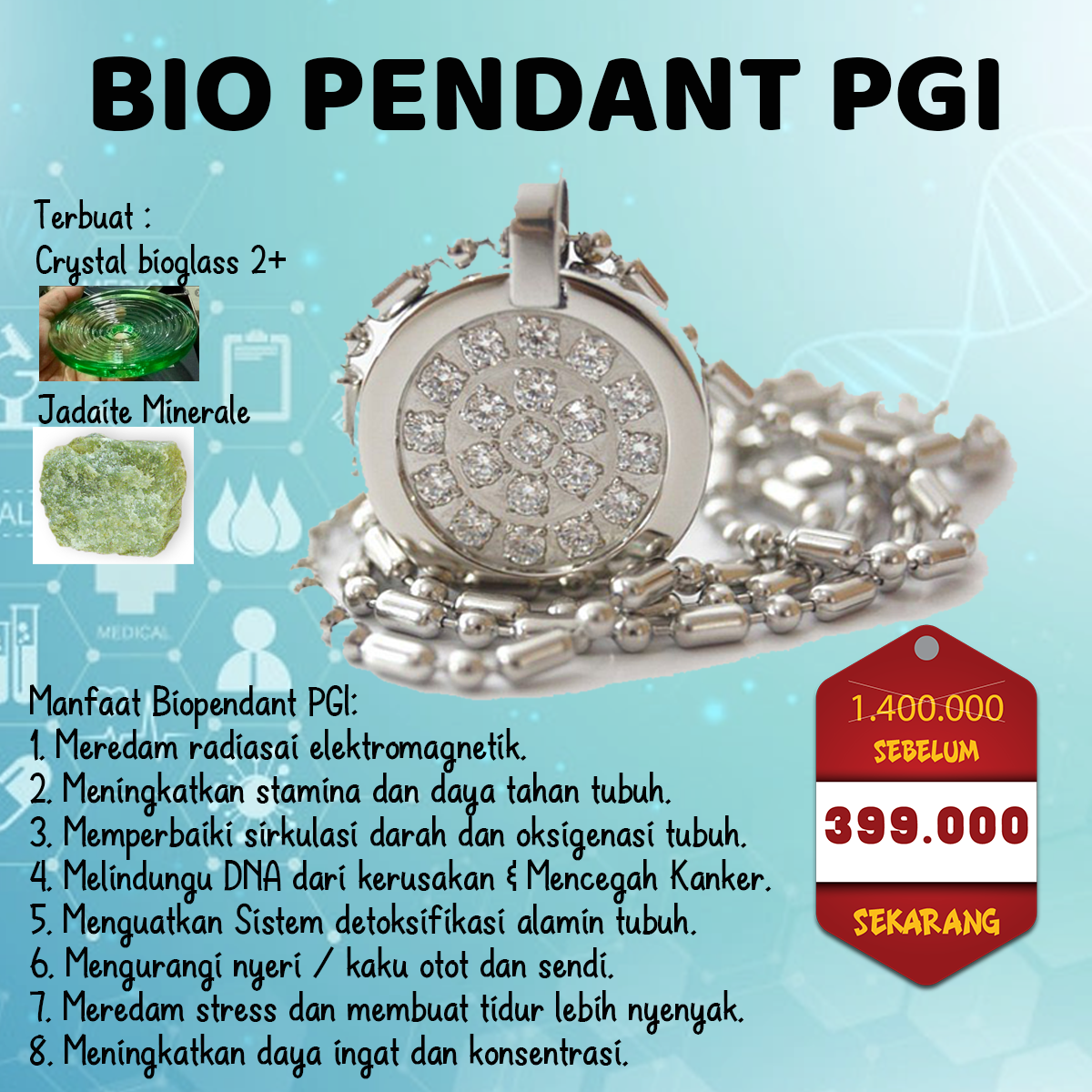 BIO PENDANT MENGANDUNG ION NEGATIF YG BERFUNGSI MENGURANGI PELEKATAN DARAH KARENA KOLESTEROL, MEMPUNYAI ZAT ANTI KANKER, MELANCARKAN PEREDARAN DARAH, MENGURANGI EFEK BURUK RADIASI, MENGATASI PUSING/MIGRAIN, SERTA MEMBANTU PEMULIHAN PENYAKIT JANTUNG DAN STRUK.