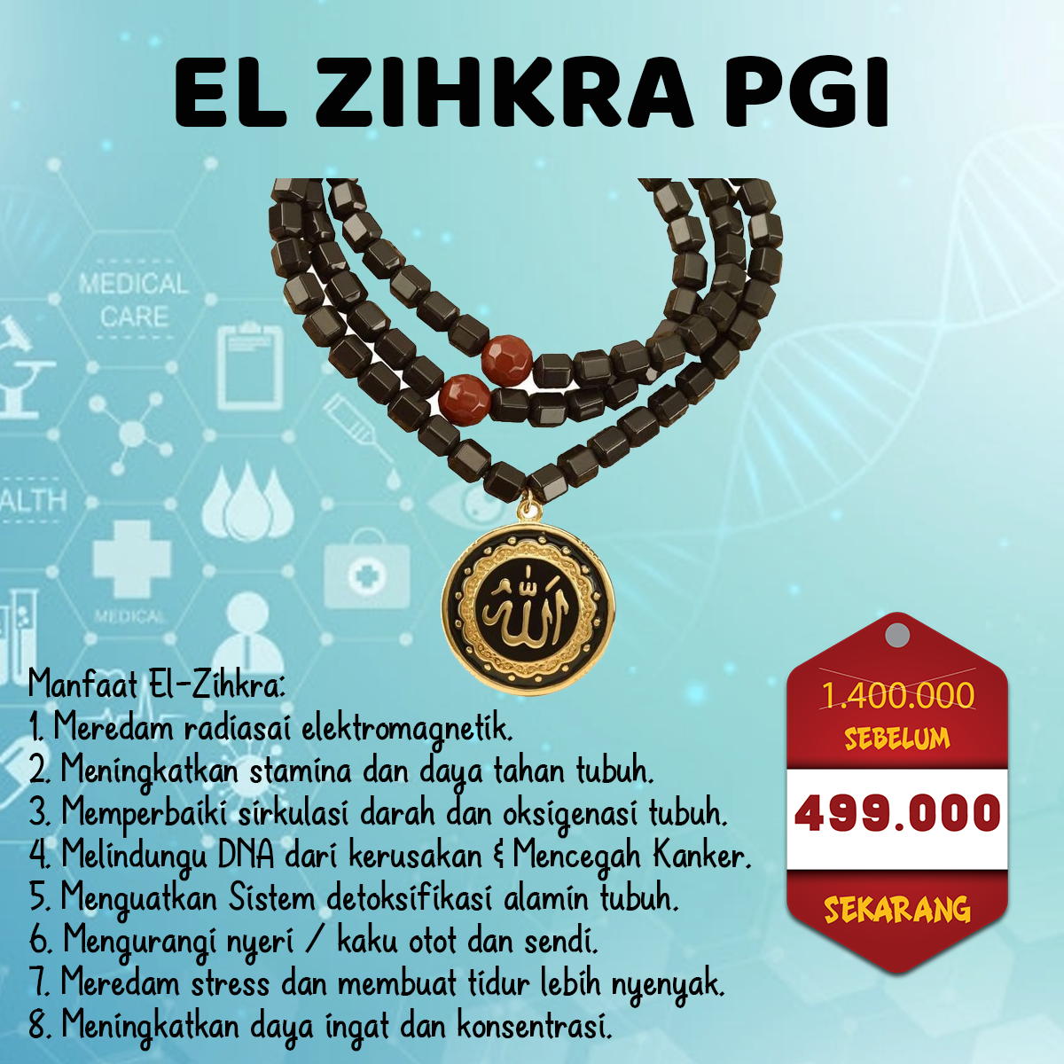 Kalung kesehatan ER ZIKRAH terdiri dari batu mulia alami yang memiliki berbagai kandungan mineral berpadu dengan cahaya infra merah jarak jauh yang dipercaya untuk mengatasi berbagai masalah kesehatan dalam tubuh manusia. Penyakit mematikan paling tinggi terjadi akibat pengentalan darah karena pola hidup yang kurang sehat. Saatnya lindungi tubuh anda dari bahaya obat kimia, beralih pada alami tanpa efek samping.